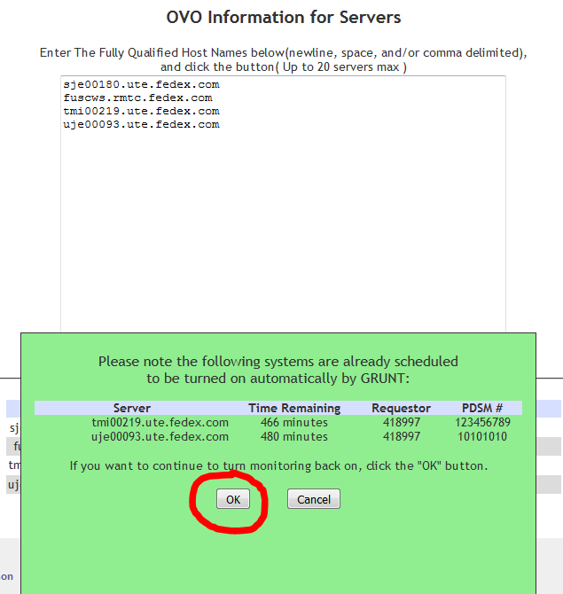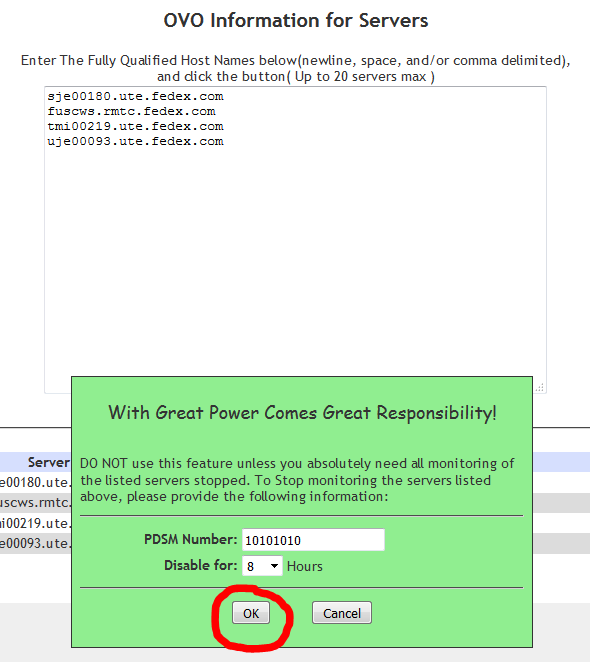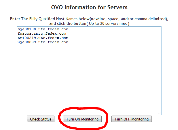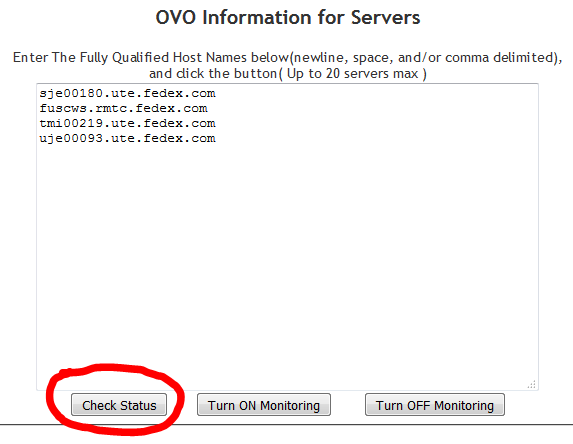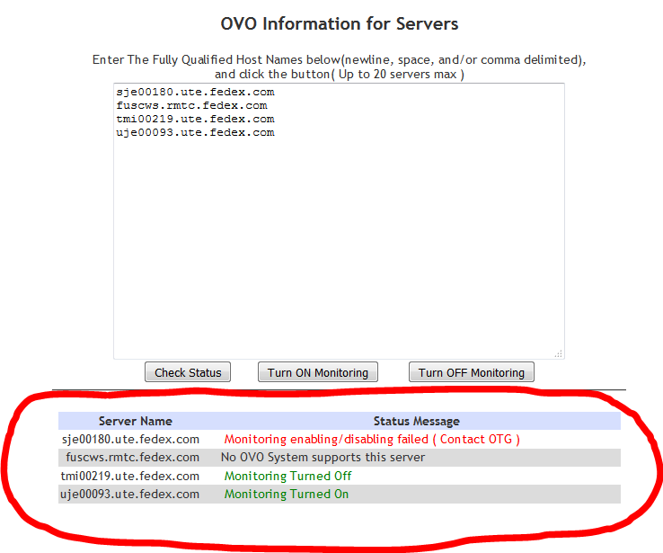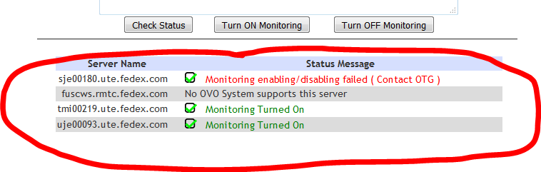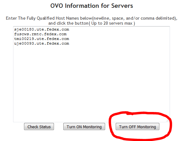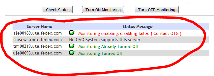 Since all servers were requested to have monitoring disabled, the resulting list indicates all servers that are not being monitored now. Since uje00093.ute.fedex.com was the only server that was being monitored, it is the only one with a valid "turned off" message.