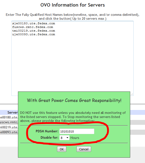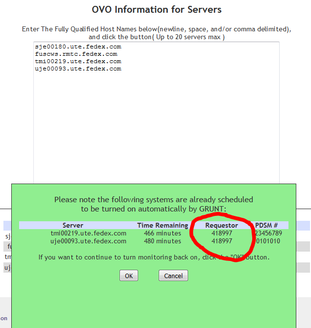 All things being equal, no such thing as a perfect tool, and this one is no exception. If there is a problem, and the automation/request can not turn a server(node) monitoring status back on, a few things happen. 1) An RT ticket is opened automatically in the OVO Queue to alert OVO something has happened for the 1+ nodes that were being turned on. 2) Audit messages are logged on the OVO server as well as on the GRUNT server about the servers/nodes and the issue they experienced for research information. 3) An email is sent to the user(whether they triggered the event, or the automation did), reporting about the issue.